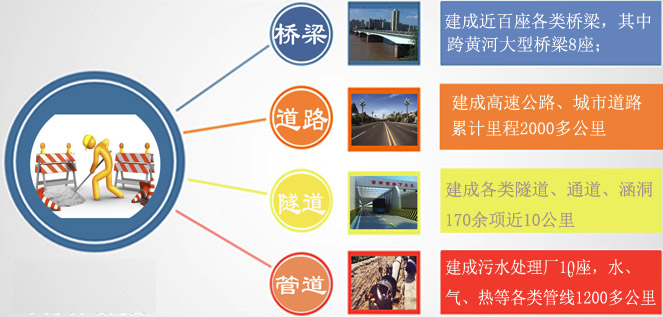 工程施工公司成立以來(lái)承建了蘭州市主要城市主干道及燃?xì)?、熱力、輸水管網(wǎng),建成近百座各類(lèi)橋梁,其中跨黃河大型橋梁8座;建成高速公路、城市道路累計(jì)里程2000多公里;建成污水處理廠(chǎng)19座,給水、雨污水、燃?xì)狻崃Φ裙芫€(xiàn)工程1200多公里;建成房屋建筑20多萬(wàn)平米;建成各類(lèi)隧道、通道、涵洞170余項(xiàng)近10公里。項(xiàng)目分布在甘肅和地州市及陜西、寧夏、青海、新疆、貴州、廣東、廣西等省市。