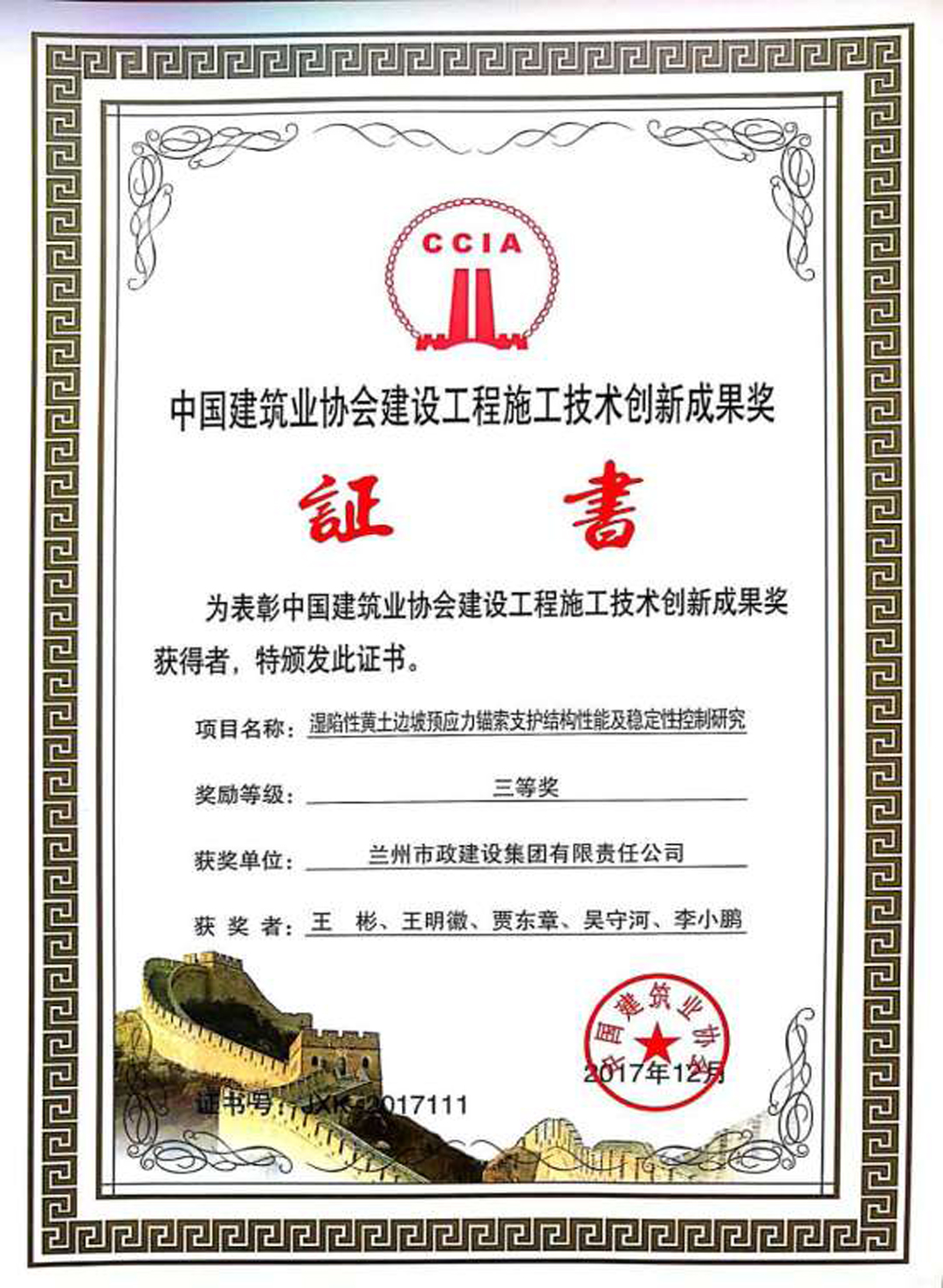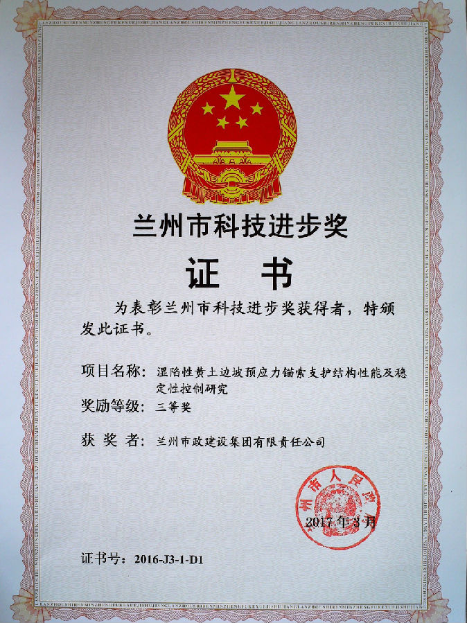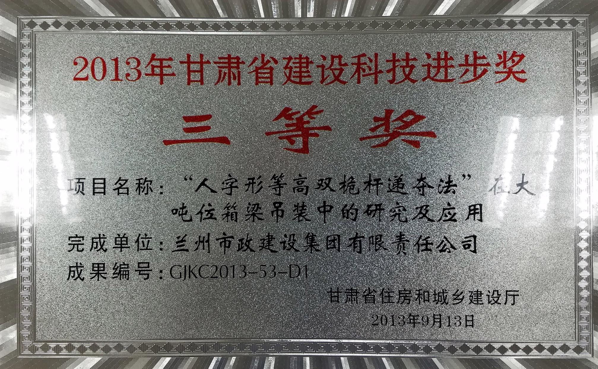 科技進步獎公司堅持實施“科技興司”戰(zhàn)略,產(chǎn)、學(xué)、研結(jié)合,大力開展“四新”技術(shù)及建筑業(yè)“十項”新技術(shù)的應(yīng)用、研發(fā)和推廣,取得了一大批自主研發(fā)成果,公司獲得國家專利8項、國家級工法2項、省級工法20項、省建設(shè)科技進步獎15項、省建設(shè)科技示范工程4項,通過省建設(shè)科技成果鑒定21項,大部分科技成果處于國內(nèi)領(lǐng)先水平,公司曾獲得“全國建筑業(yè)科技進步與技術(shù)創(chuàng)新先進企業(yè)”、“肅省技術(shù)優(yōu)勢企業(yè)”等稱號,公司技術(shù)實力處于西北同行業(yè)前列。