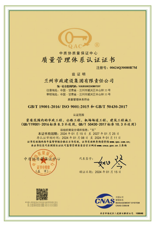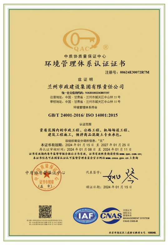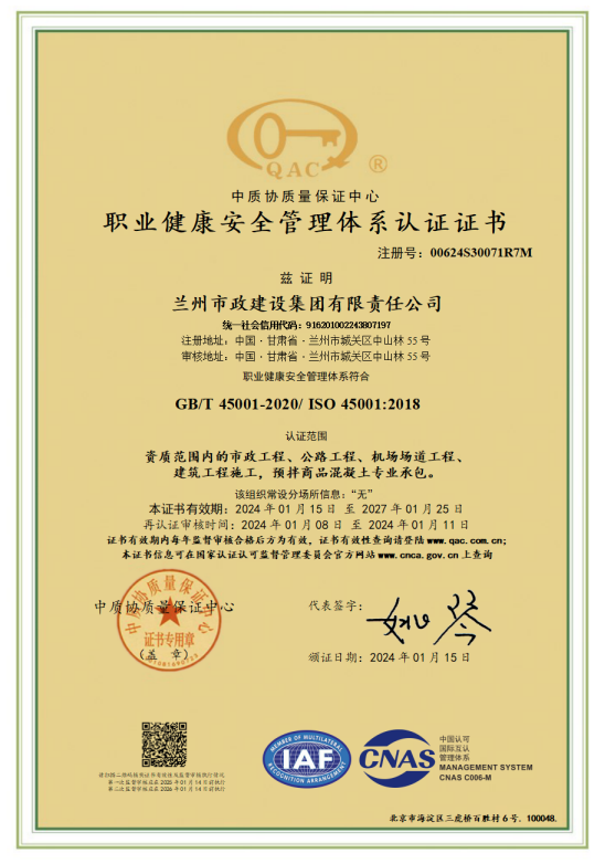 1月23日,蘭州市政建設(shè)集團(tuán)順利通過ISO9001質(zhì)量管理體系、ISO14001環(huán)境管理體系、ISO45001職業(yè)健康安全管理體系再認(rèn)證審核,蘭州市政建設(shè)集團(tuán)已連續(xù)27年通過ISO綜合管理體系認(rèn)證。