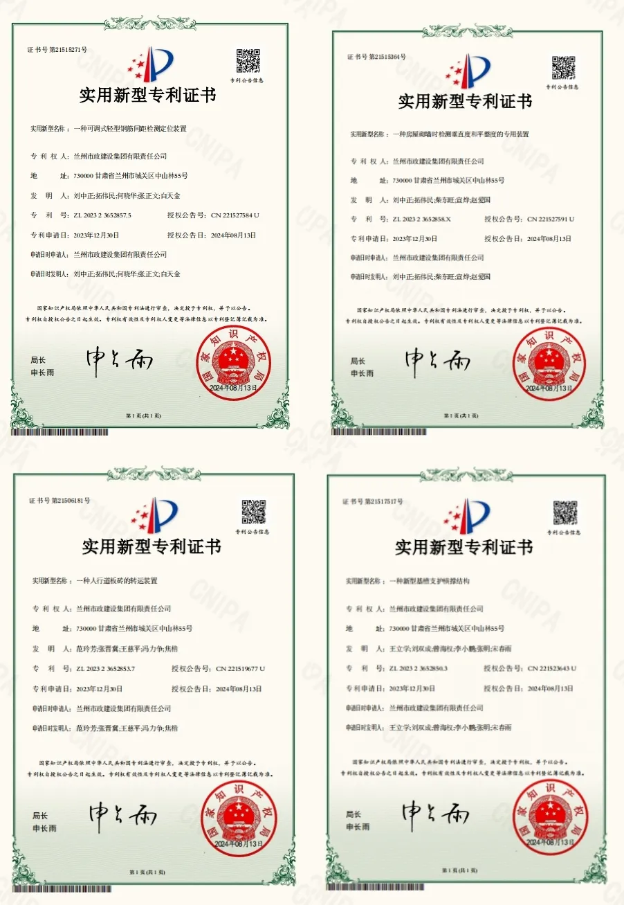 近日,蘭州市政建設集團獲《一種新型基槽支護橫撐結(jié)構(gòu)》《一種人行道板磚的轉(zhuǎn)運裝置》《一種可調(diào)式輕型鋼筋間距檢測定位裝置》《一種房屋砌墻時檢測垂直度和平整度的專用裝置》4項國家實用新型專利。繼公司5月獲得《一種輔助花崗巖路面鋪裝的移動式多功能裝置》國家實用新型專利授權(quán)后,進一步彰顯了公司研發(fā)實力和創(chuàng)新能力的突破。
