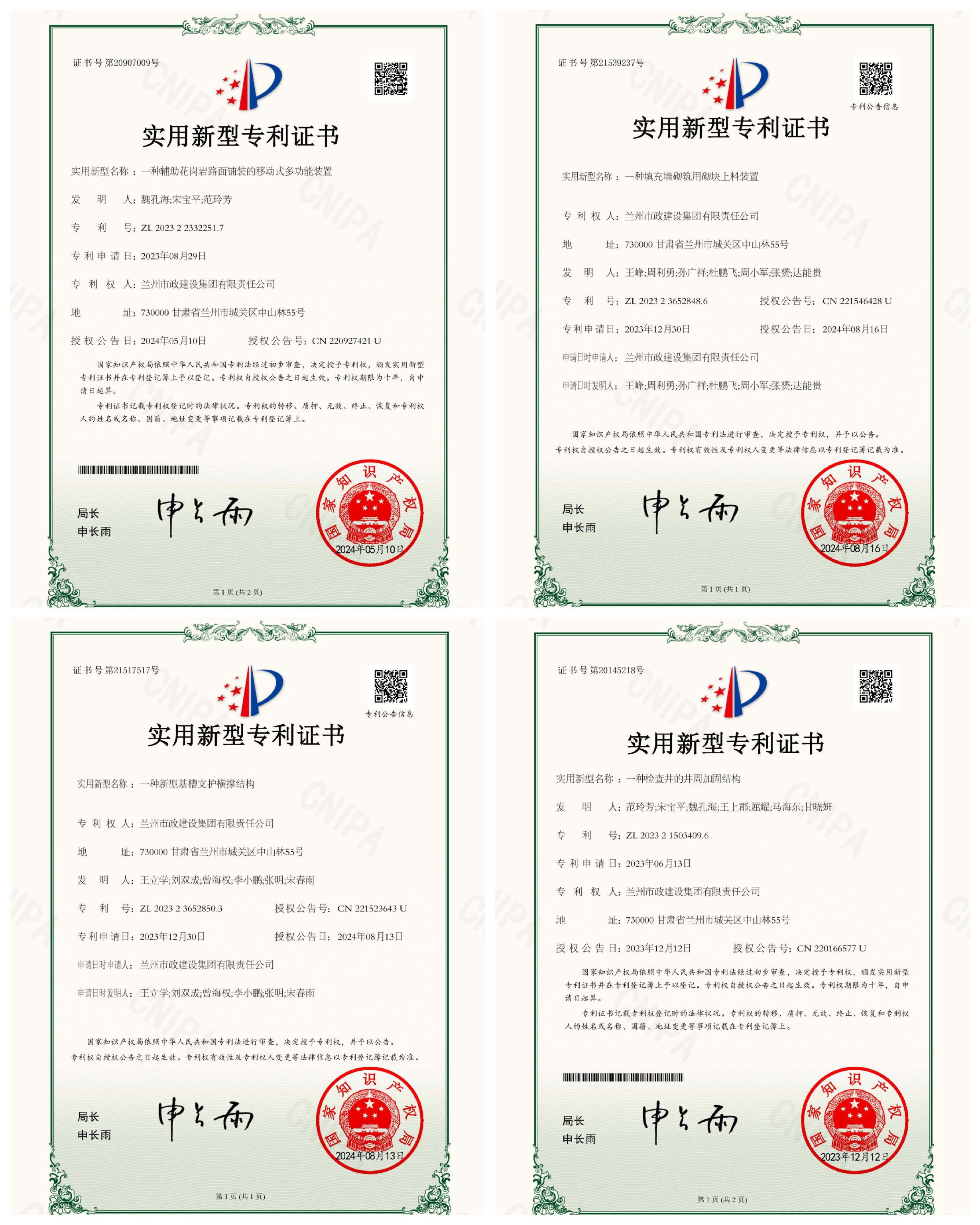 蘭州市政集團(tuán)緊密結(jié)合在建工程施工特點(diǎn),針對工程施工中的難點(diǎn)及瓶頸問題,持續(xù)加大科技研發(fā)投入,積極開展技術(shù)研發(fā)活動。2024年,公司新增“一種輔助花崗巖路面鋪裝的移動式多功能裝置”“一種填充墻砌筑用砌塊上料裝置”等實(shí)用新型專利授權(quán)11項,完成“一種水下灌注樁成孔垂直度檢測裝置”“一種裝配式鋼筋籠定位裝置”等實(shí)用新型專利受理10項,完成“一種濕陷性黃土區(qū)域邊坡防護(hù)結(jié)構(gòu)及方法”“路緣石安裝定位裝置及其施工方法”發(fā)明專利受理2項。