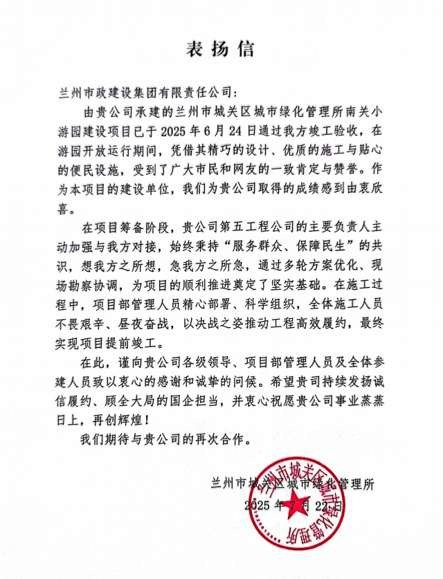 近日,蘭州市政建設(shè)集團收到蘭州市城關(guān)區(qū)城市綠化管理所發(fā)來的表揚信,信中對我司承建的南關(guān)小游園建設(shè)項目圓滿完成施工任務(wù)給予高度認可。